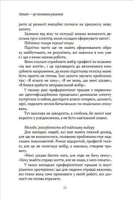 Книга буде корисною як досвідченим практикам, так і тим, хто лише вибудовує власну систему роботи з профорієнтаційними запитами.