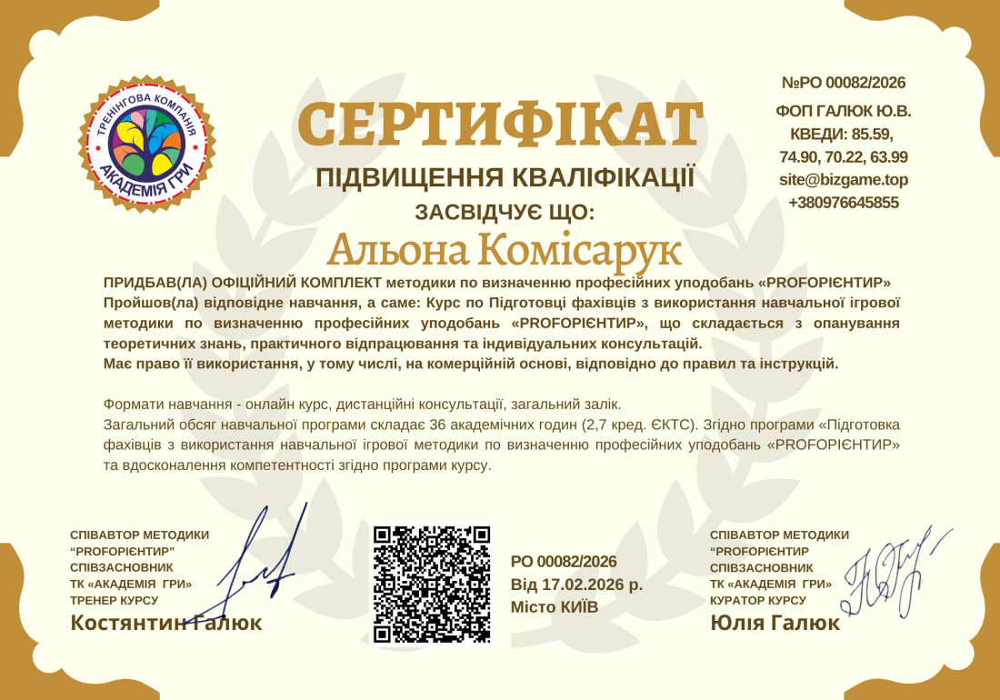 Програма підвищення кваліфікації педагогічних працівників: «Підготовка фахівців з використання навчальної ігрової методики по визначенню професійних уподобань «PROFОРІЄНТИР»