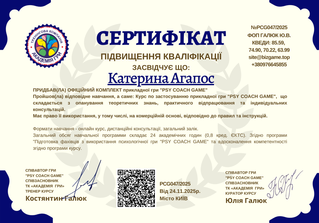 Головна / Реєстр сертифікатів / Катерина Агапос PCG047/2025