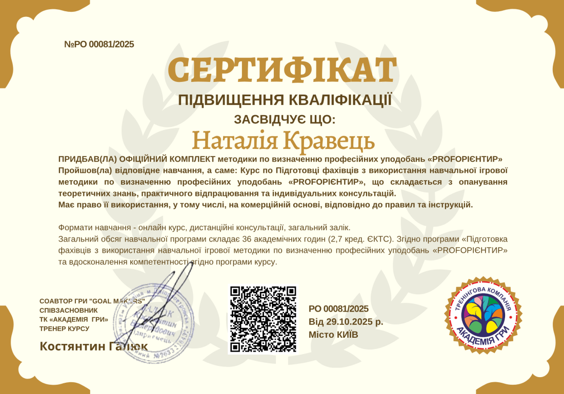Програма підвищення кваліфікації педагогічних працівників: «Підготовка фахівців з використання навчальної ігрової методики по визначенню професійних уподобань «PROFОРІЄНТИР»