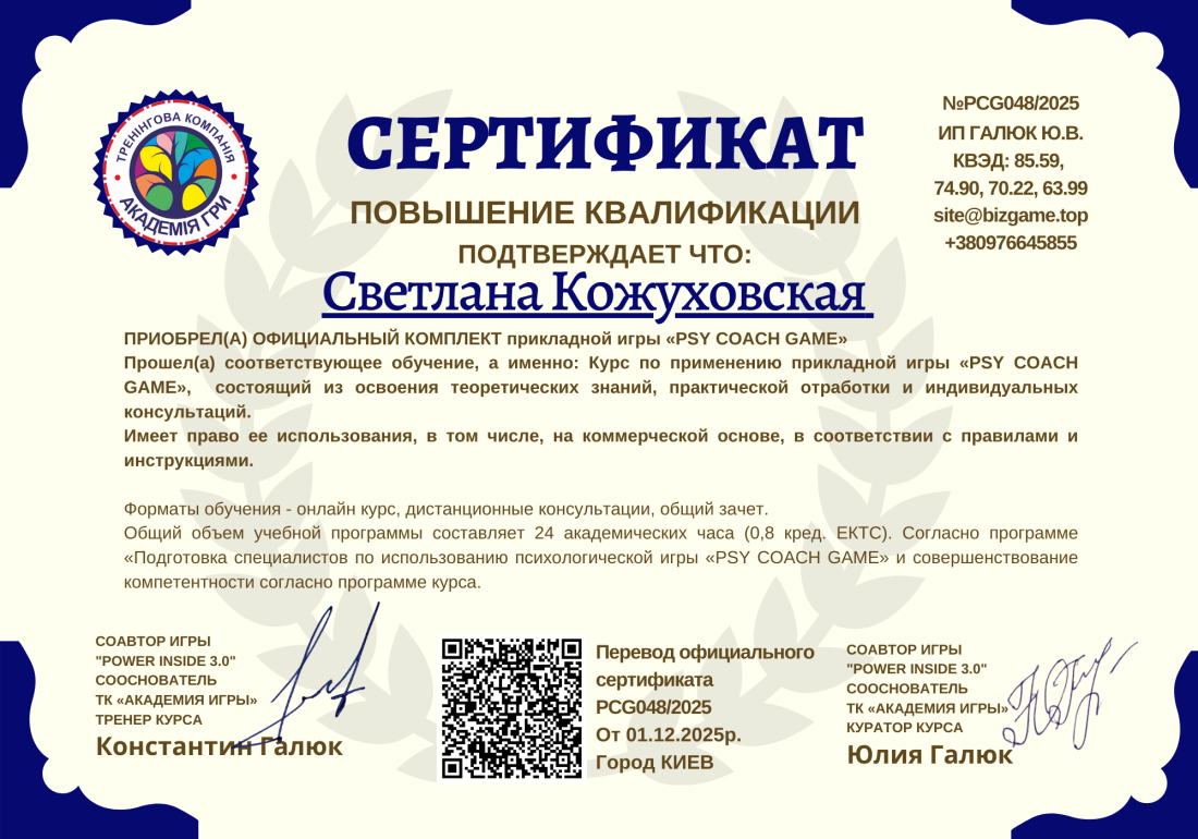 Головна / Реєстр сертифікатів / Светлана Кожуховская PCG048/2025