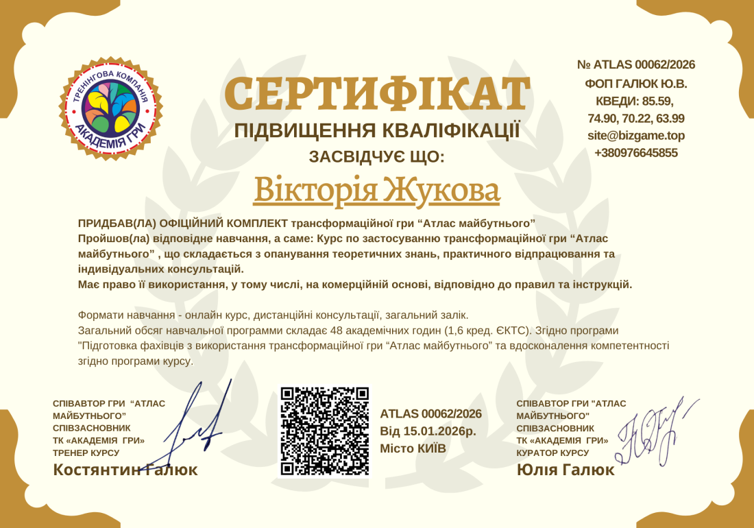 Головна / Реєстр сертифікатів / Вікторія Жукова ATLAS 00062/2026
